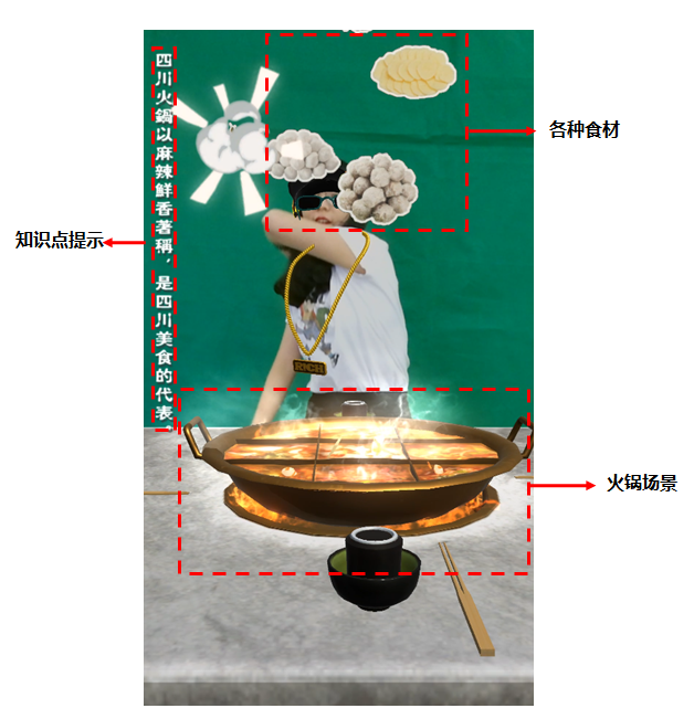这时从天而降四川火锅,会落下各种不同的火锅食材,体验者可手挥动打掉食材;