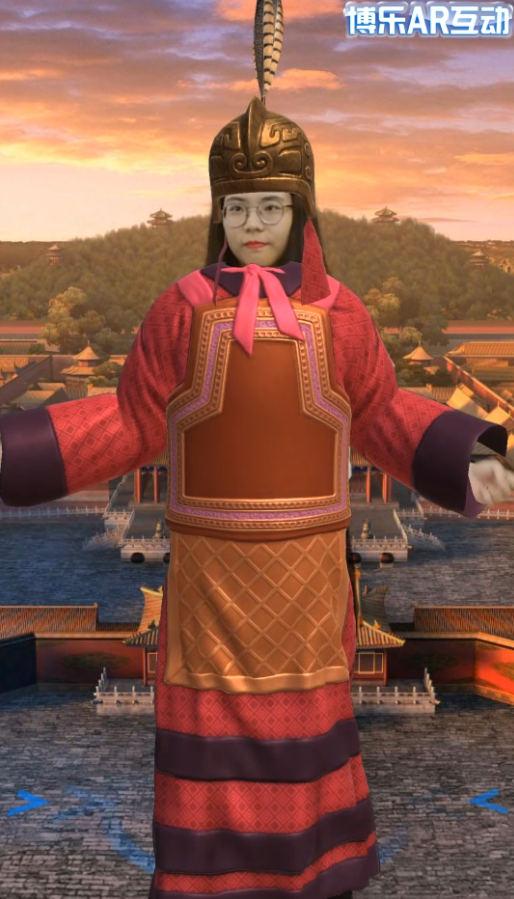 该AR互动利用三维建模建立牛魔王模型,结合骨骼绑定与追踪等先进的AR制作技术,使得AR互动体验者站在屏前,可即刻换装,体验商朝妇好将军服饰,同时系统会自动拍照留念。